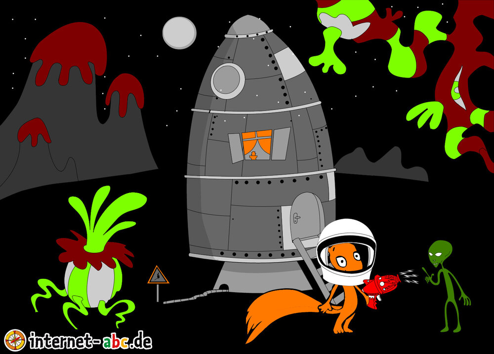 Mit der Rakete fliegen die 4 Internet-ABC-Tiere in den Weltraum. Was sie dort sehen und erleben, könnt ihr in diesem Baukasten malen und erzählen.