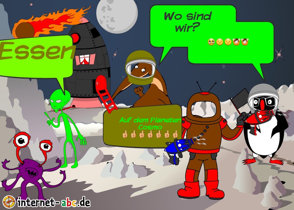 Mit der Rakete fliegen die 4 Internet-ABC-Tiere in den Weltraum. Was sie dort sehen und erleben, könnt ihr in diesem Baukasten malen und erzählen.