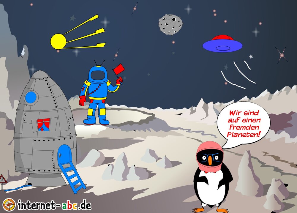 Mit der Rakete fliegen die 4 Internet-ABC-Tiere in den Weltraum. Was sie dort sehen und erleben, könnt ihr in diesem Baukasten malen und erzählen.