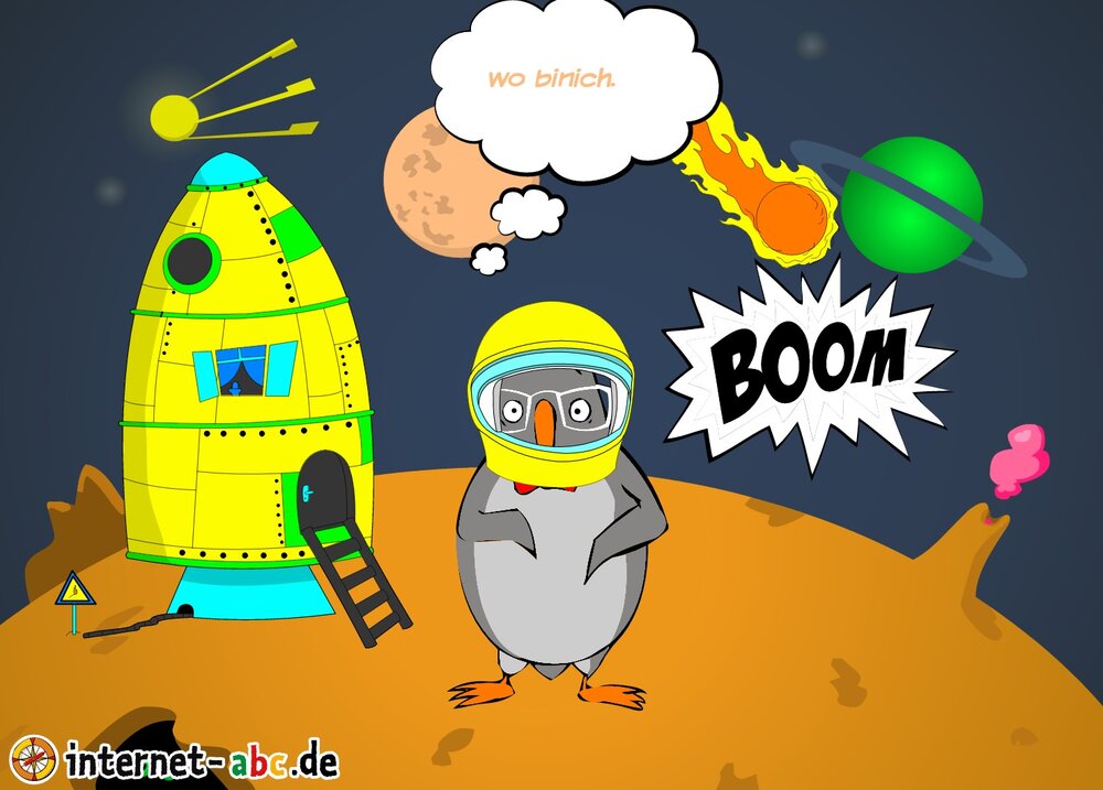 Mit der Rakete fliegen die 4 Internet-ABC-Tiere in den Weltraum. Was sie dort sehen und erleben, könnt ihr in diesem Baukasten malen und erzählen.