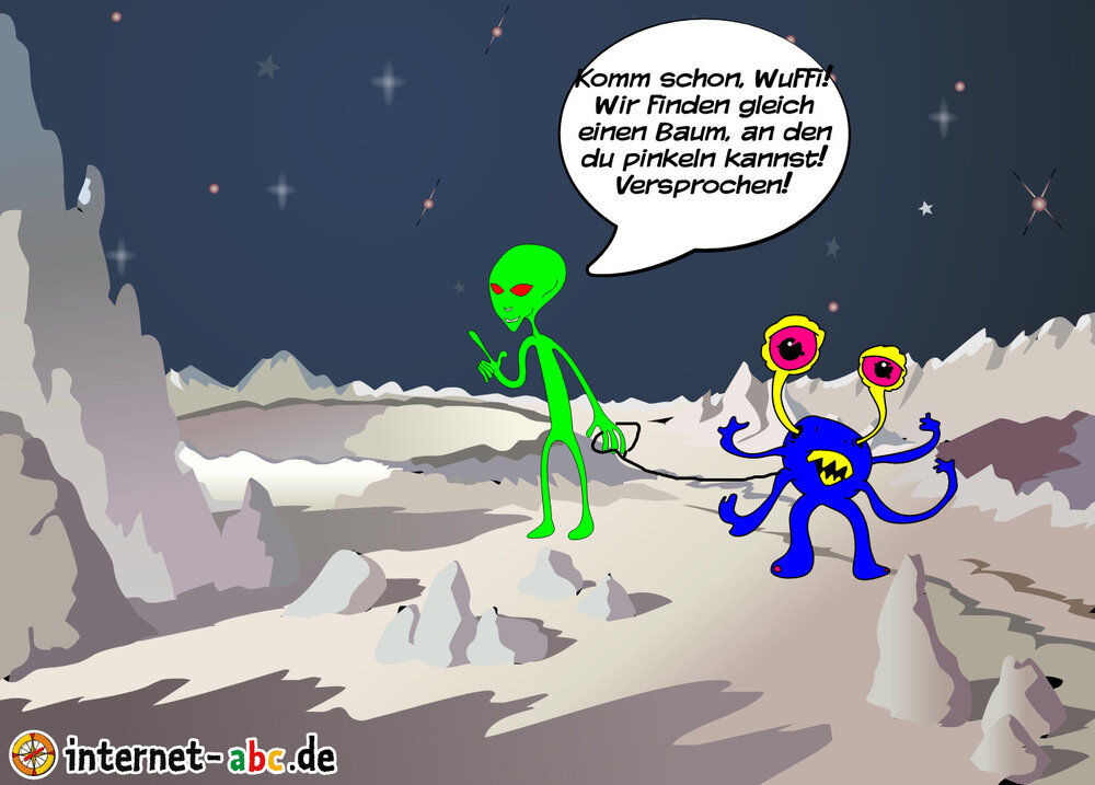 Ein Alien sucht mit seinem Hund einen Baum zum Pinkeln.