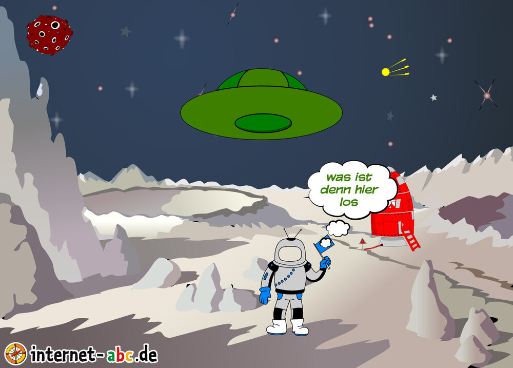 Mit der Rakete fliegen die 4 Internet-ABC-Tiere in den Weltraum. Was sie dort sehen und erleben, könnt ihr in diesem Baukasten malen und erzählen.