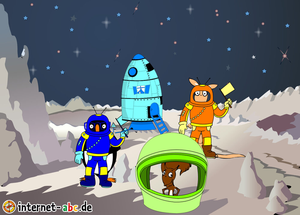 Mit der Rakete fliegen die 4 Internet-ABC-Tiere in den Weltraum. Was sie dort sehen und erleben, könnt ihr in diesem Baukasten malen und erzählen.
