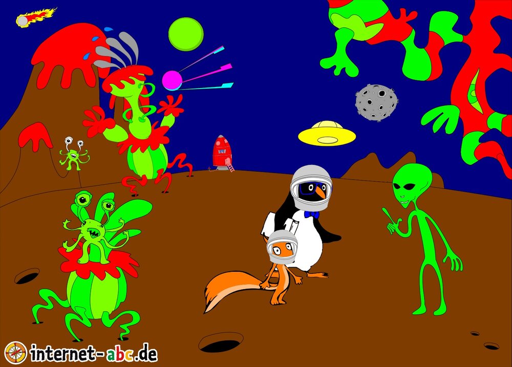 Mit der Rakete fliegen die 4 Internet-ABC-Tiere in den Weltraum. Was sie dort sehen und erleben, könnt ihr in diesem Baukasten malen und erzählen.