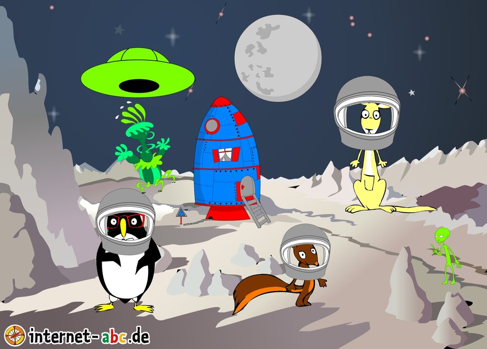 Mit der Rakete fliegen die 4 Internet-ABC-Tiere in den Weltraum. Was sie dort sehen und erleben, könnt ihr in diesem Baukasten malen und erzählen.