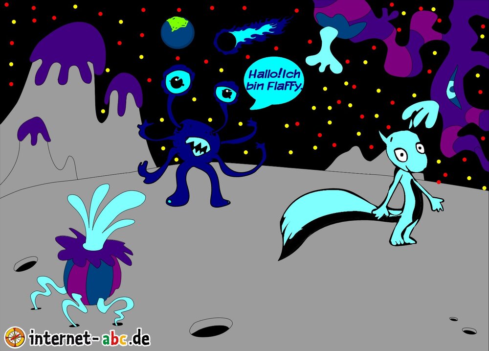 Mit der Rakete fliegen die 4 Internet-ABC-Tiere in den Weltraum. Was sie dort sehen und erleben, könnt ihr in diesem Baukasten malen und erzählen.