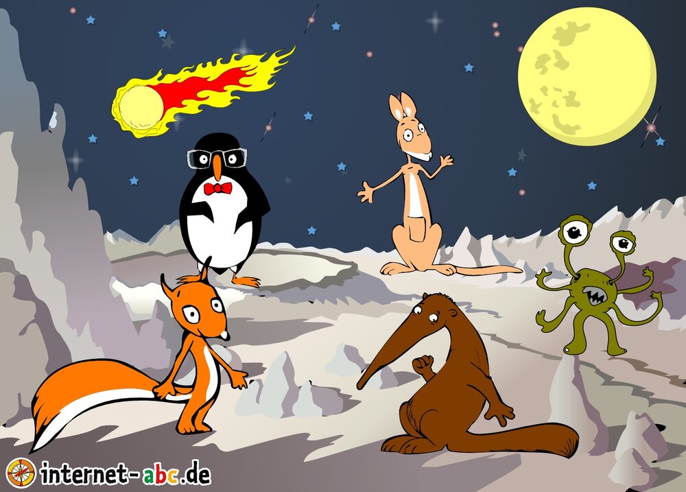 Mit der Rakete fliegen die 4 Internet-ABC-Tiere in den Weltraum. Was sie dort sehen und erleben, könnt ihr in diesem Baukasten malen und erzählen.