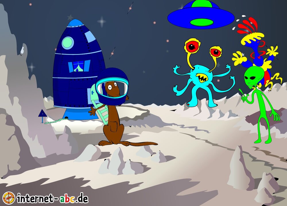 Mit der Rakete fliegen die 4 Internet-ABC-Tiere in den Weltraum. Was sie dort sehen und erleben, könnt ihr in diesem Baukasten malen und erzählen.