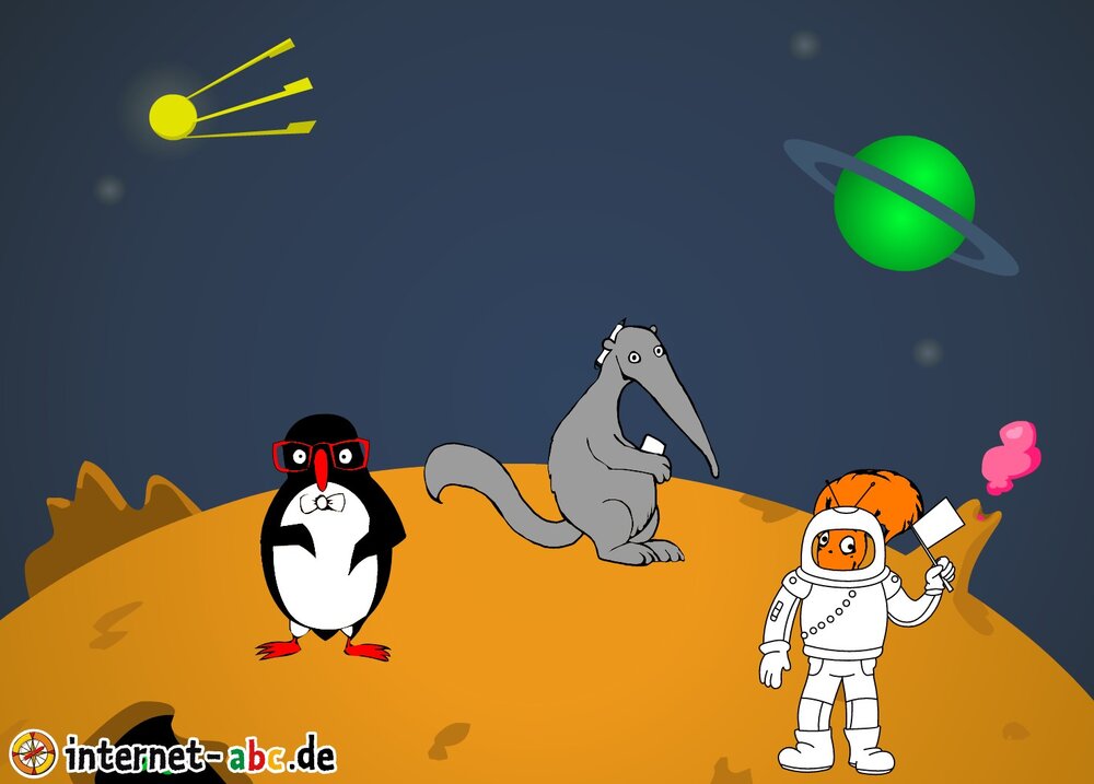 Mit der Rakete fliegen die 4 Internet-ABC-Tiere in den Weltraum. Was sie dort sehen und erleben, könnt ihr in diesem Baukasten malen und erzählen.