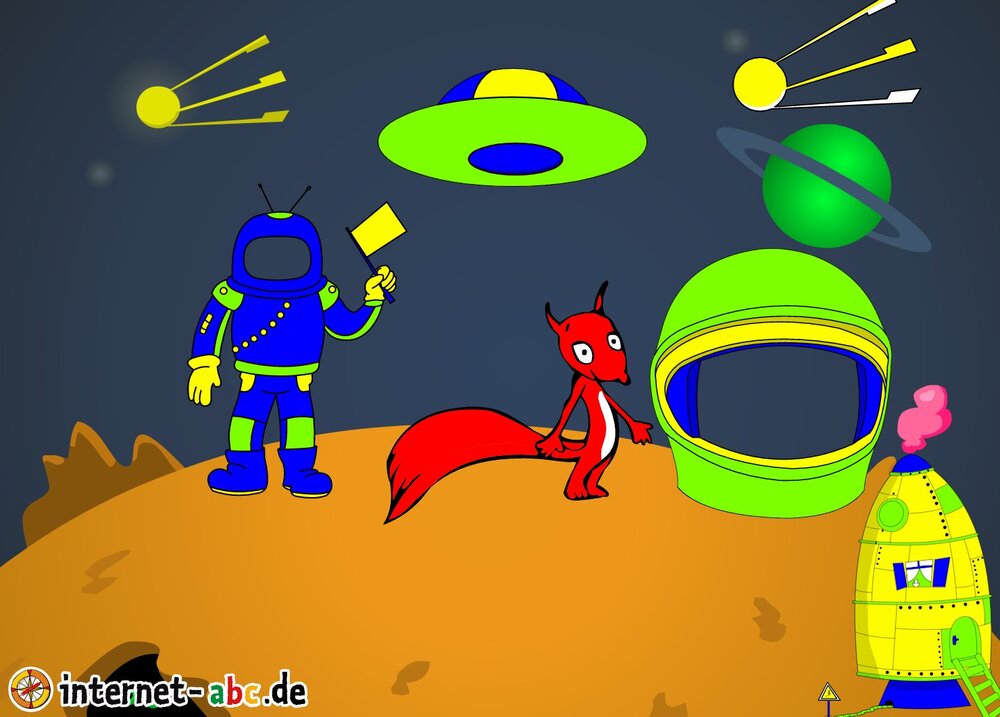 Mit der Rakete fliegen die 4 Internet-ABC-Tiere in den Weltraum. Was sie dort sehen und erleben, könnt ihr in diesem Baukasten malen und erzählen.