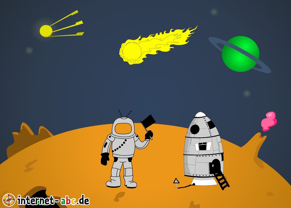 Mit der Rakete fliegen die 4 Internet-ABC-Tiere in den Weltraum. Was sie dort sehen und erleben, könnt ihr in diesem Baukasten malen und erzählen.