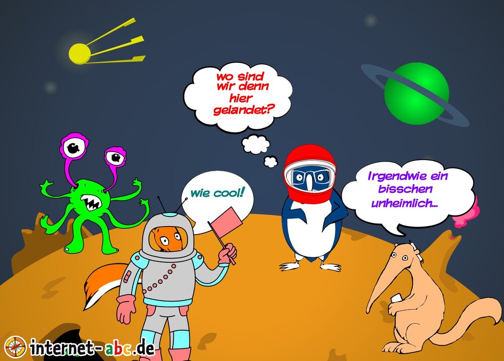 Mit der Rakete fliegen die 4 Internet-ABC-Tiere in den Weltraum. Was sie dort sehen und erleben, könnt ihr in diesem Baukasten malen und erzählen.