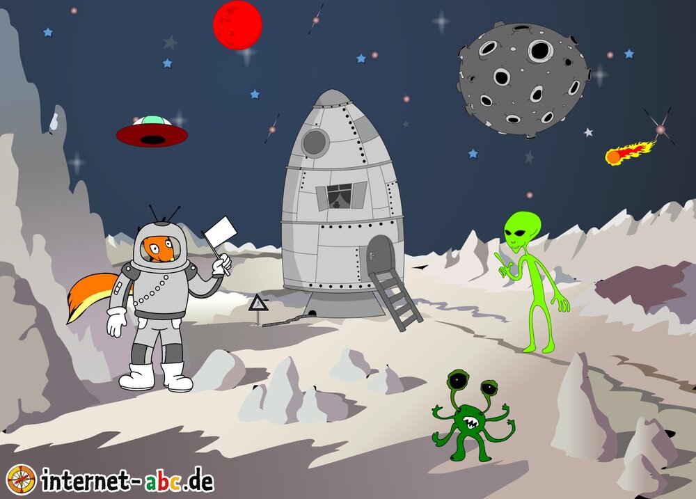 Mit der Rakete fliegen die 4 Internet-ABC-Tiere in den Weltraum. Was sie dort sehen und erleben, könnt ihr in diesem Baukasten malen und erzählen.