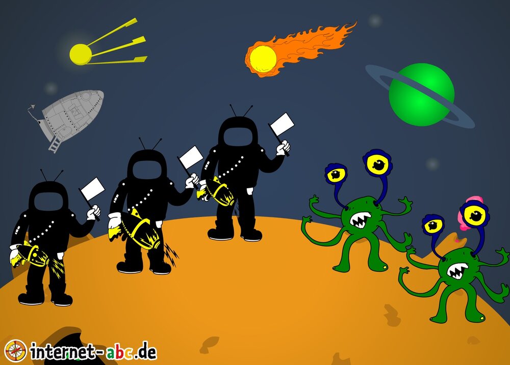 Mit der Rakete fliegen die 4 Internet-ABC-Tiere in den Weltraum. Was sie dort sehen und erleben, könnt ihr in diesem Baukasten malen und erzählen.