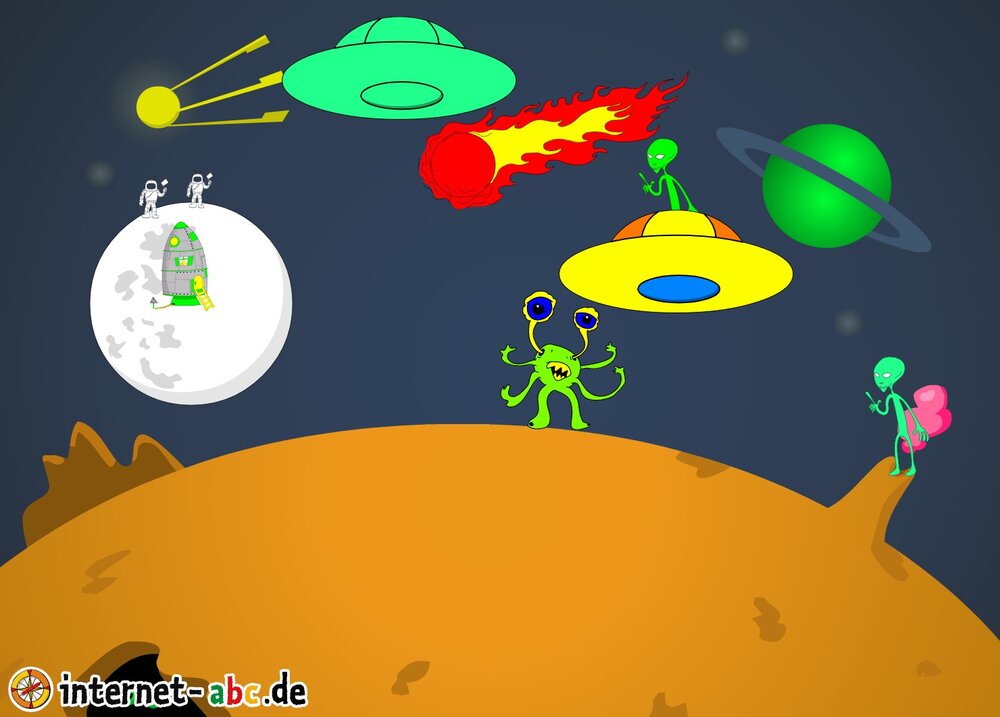 Mit der Rakete fliegen die 4 Internet-ABC-Tiere in den Weltraum. Was sie dort sehen und erleben, könnt ihr in diesem Baukasten malen und erzählen.
