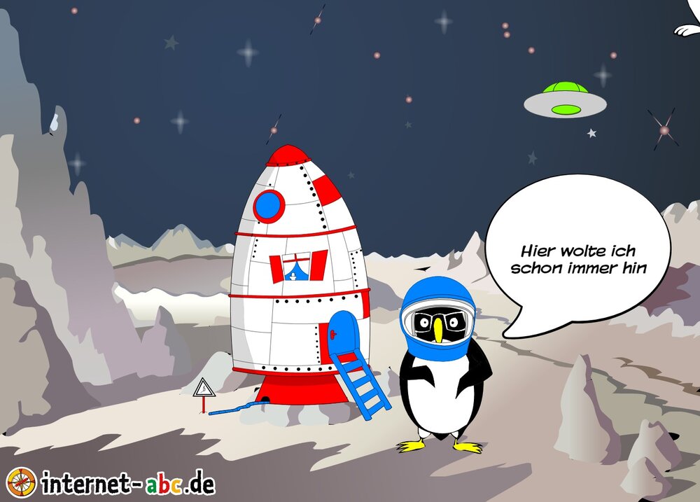 Mit der Rakete fliegen die 4 Internet-ABC-Tiere in den Weltraum. Was sie dort sehen und erleben, könnt ihr in diesem Baukasten malen und erzählen.