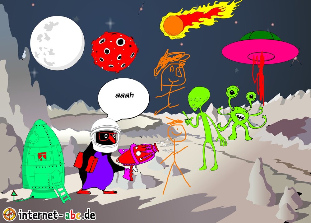 Mit der Rakete fliegen die 4 Internet-ABC-Tiere in den Weltraum. Was sie dort sehen und erleben, könnt ihr in diesem Baukasten malen und erzählen.
