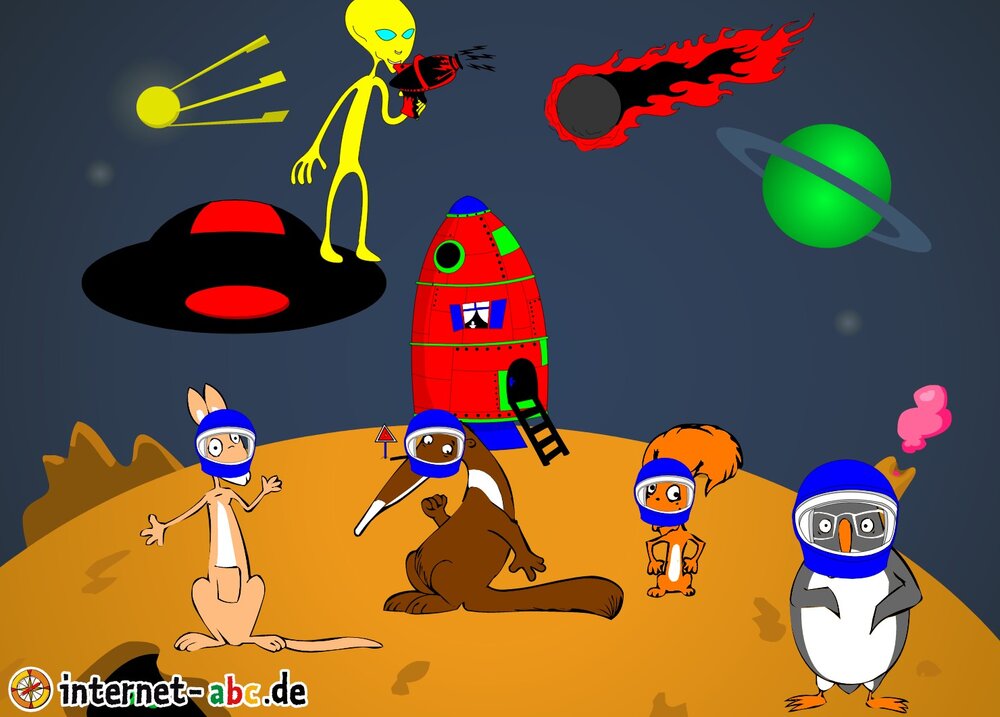 Mit der Rakete fliegen die 4 Internet-ABC-Tiere in den Weltraum. Was sie dort sehen und erleben, könnt ihr in diesem Baukasten malen und erzählen.