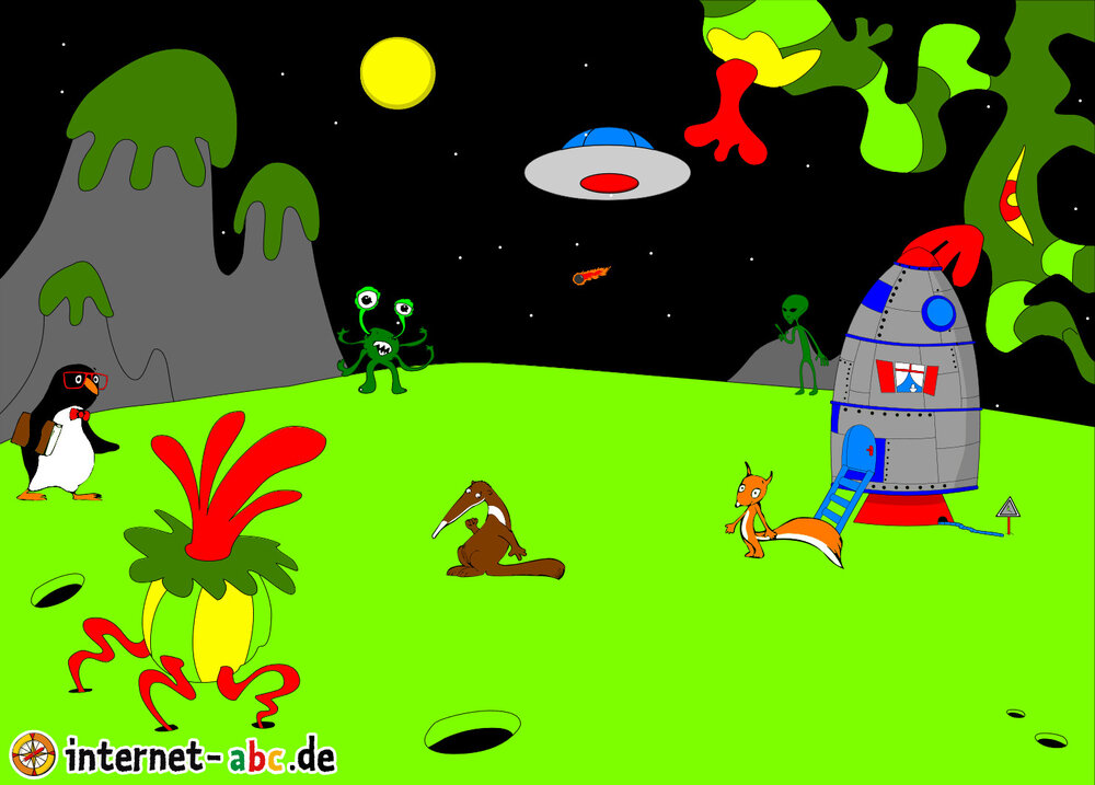 Mit der Rakete fliegen die 4 Internet-ABC-Tiere in den Weltraum. Was sie dort sehen und erleben, könnt ihr in diesem Baukasten malen und erzählen.