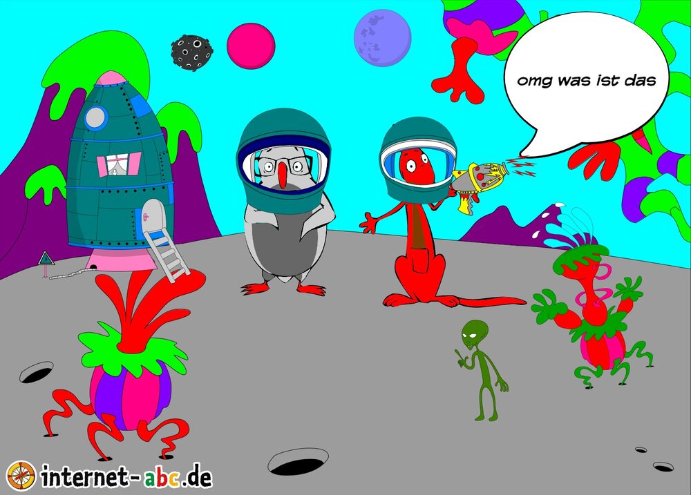 Mit der Rakete fliegen die 4 Internet-ABC-Tiere in den Weltraum. Was sie dort sehen und erleben, könnt ihr in diesem Baukasten malen und erzählen.