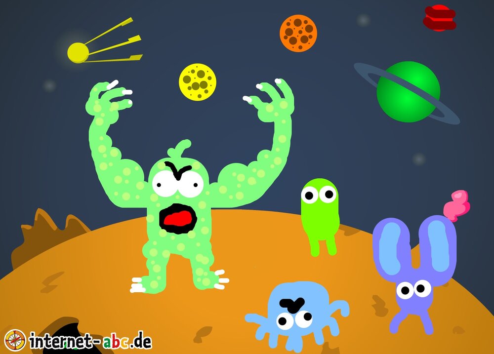 Mit der Rakete fliegen die 4 Internet-ABC-Tiere in den Weltraum. Was sie dort sehen und erleben, könnt ihr in diesem Baukasten malen und erzählen.