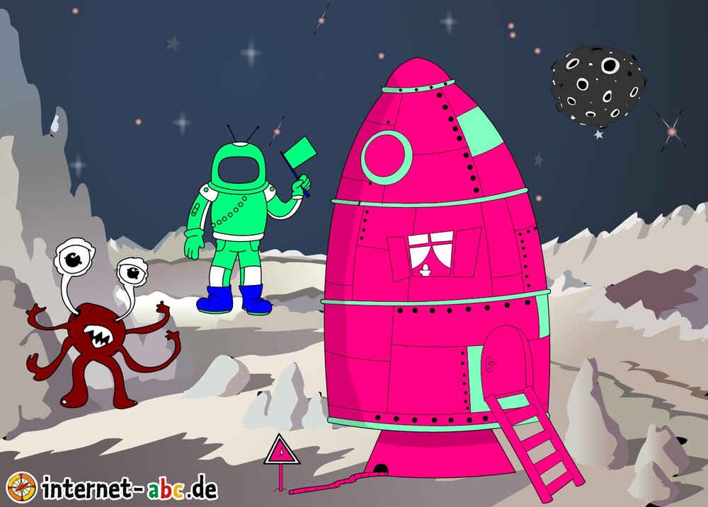 Mit der Rakete fliegen die 4 Internet-ABC-Tiere in den Weltraum. Was sie dort sehen und erleben, könnt ihr in diesem Baukasten malen und erzählen.
