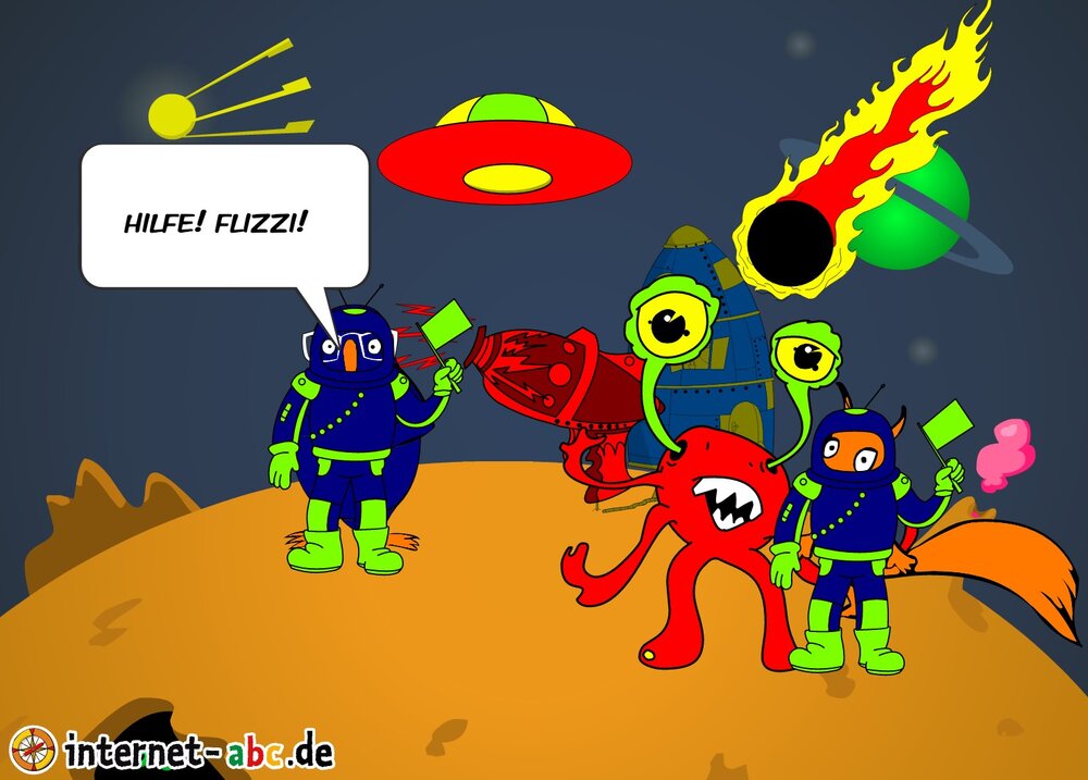 Mit der Rakete fliegen die 4 Internet-ABC-Tiere in den Weltraum. Was sie dort sehen und erleben, könnt ihr in diesem Baukasten malen und erzählen.