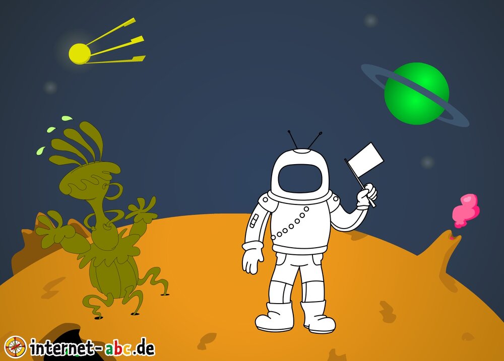 Mit der Rakete fliegen die 4 Internet-ABC-Tiere in den Weltraum. Was sie dort sehen und erleben, könnt ihr in diesem Baukasten malen und erzählen.