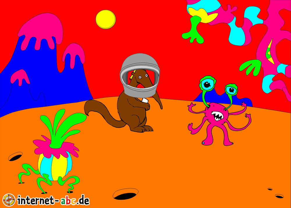 Ich bin mit meiner Rakete auf den Mars geflogen doch der aufprall war so Heftig das meine Rakete zerstört wurde. Aber ich traf ein Marsmännch mit dem Namen: Stubedel. Sie hat mir Versprochen das sie und ihre Freunde mir Helfen wollen das ich wieder zurück auf die Erde komme.