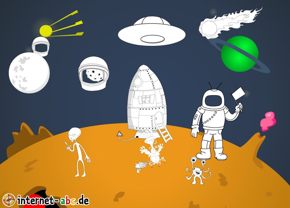 Mit der Rakete fliegen die 4 Internet-ABC-Tiere in den Weltraum. Was sie dort sehen und erleben, könnt ihr in diesem Baukasten malen und erzählen.