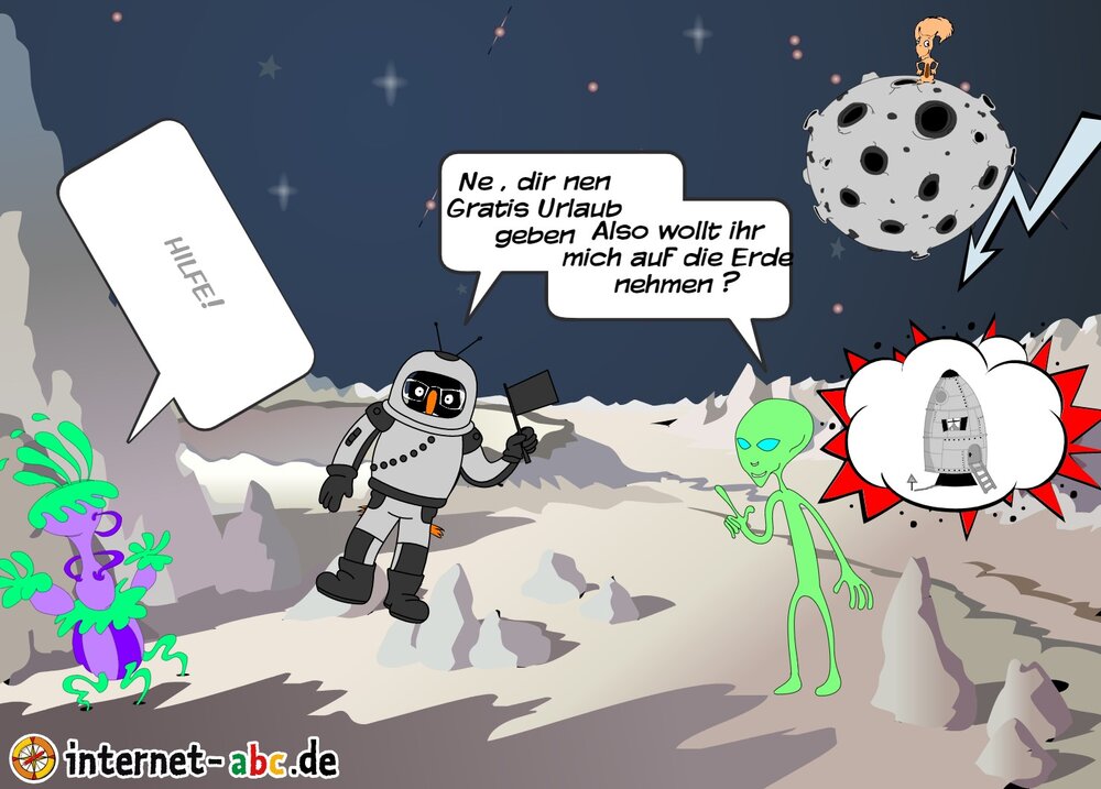 Mit der Rakete fliegen die 4 Internet-ABC-Tiere in den Weltraum. Was sie dort sehen und erleben, könnt ihr in diesem Baukasten malen und erzählen.
