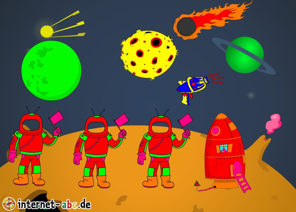 Mit der Rakete fliegen die 4 Internet-ABC-Tiere in den Weltraum. Was sie dort sehen und erleben, könnt ihr in diesem Baukasten malen und erzählen.