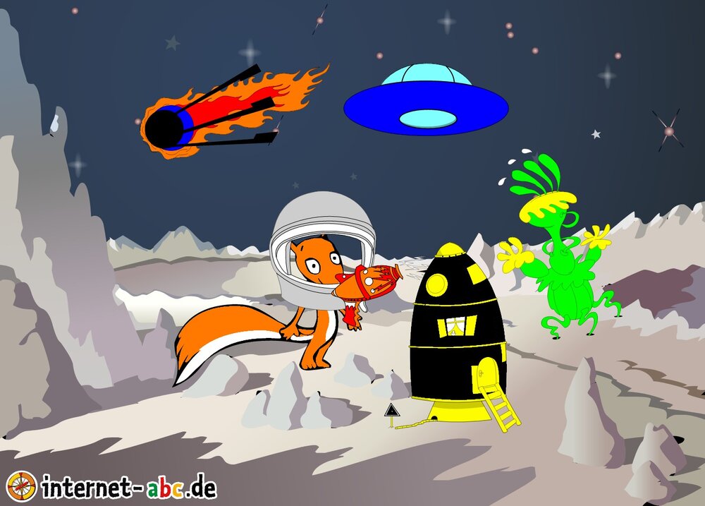 Mit der Rakete fliegen die 4 Internet-ABC-Tiere in den Weltraum. Was sie dort sehen und erleben, könnt ihr in diesem Baukasten malen und erzählen.