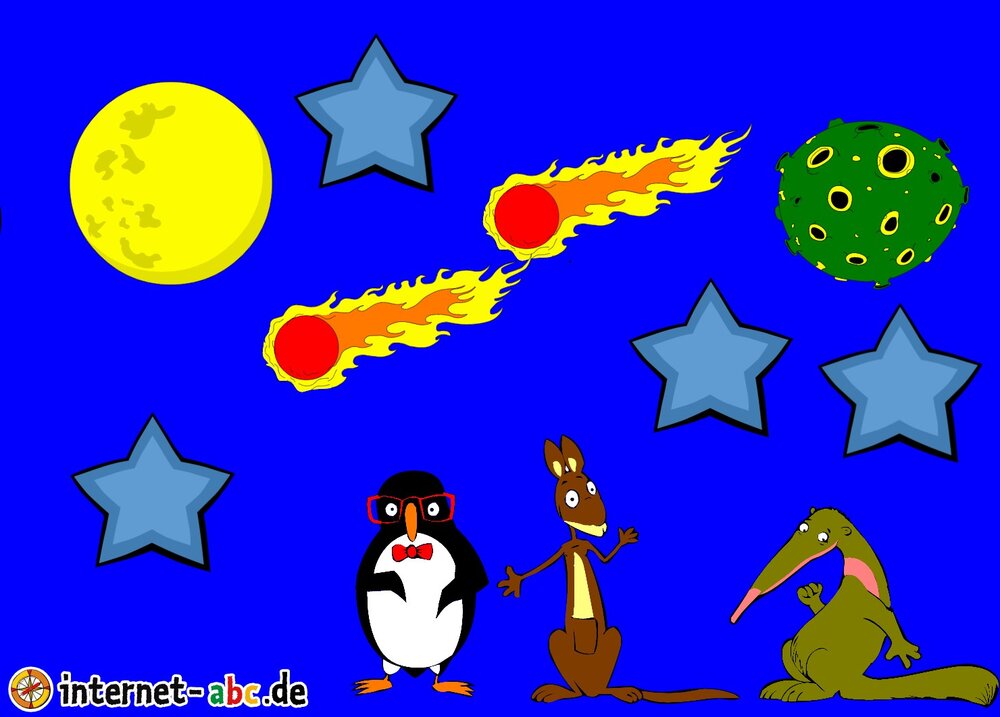 Mit der Rakete fliegen die 4 Internet-ABC-Tiere in den Weltraum. Was sie dort sehen und erleben, könnt ihr in diesem Baukasten malen und erzählen.