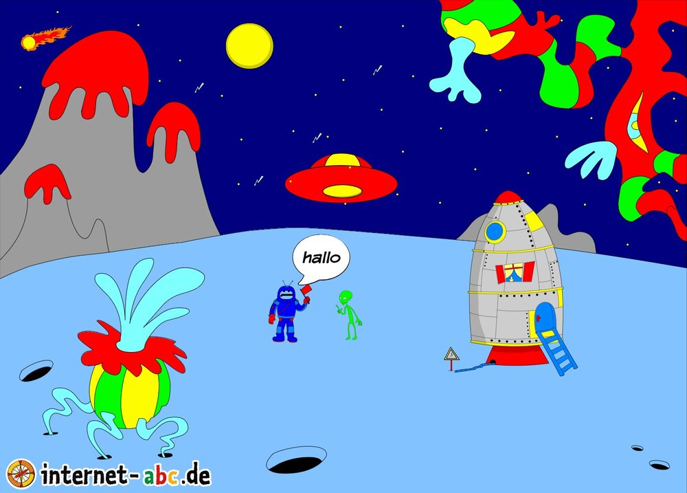 Mit der Rakete fliegen die 4 Internet-ABC-Tiere in den Weltraum. Was sie dort sehen und erleben, könnt ihr in diesem Baukasten malen und erzählen.