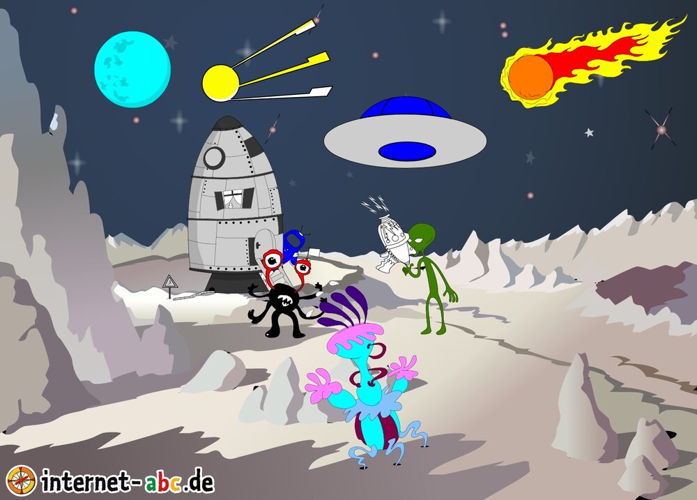 Mit der Rakete fliegen die 4 Internet-ABC-Tiere in den Weltraum. Was sie dort sehen und erleben, könnt ihr in diesem Baukasten malen und erzählen.