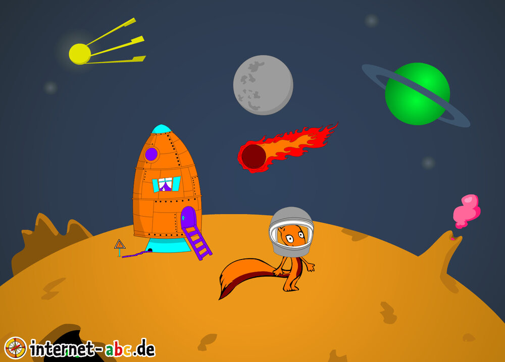 Mit der Rakete fliegen die 4 Internet-ABC-Tiere in den Weltraum. Was sie dort sehen und erleben, könnt ihr in diesem Baukasten malen und erzählen.