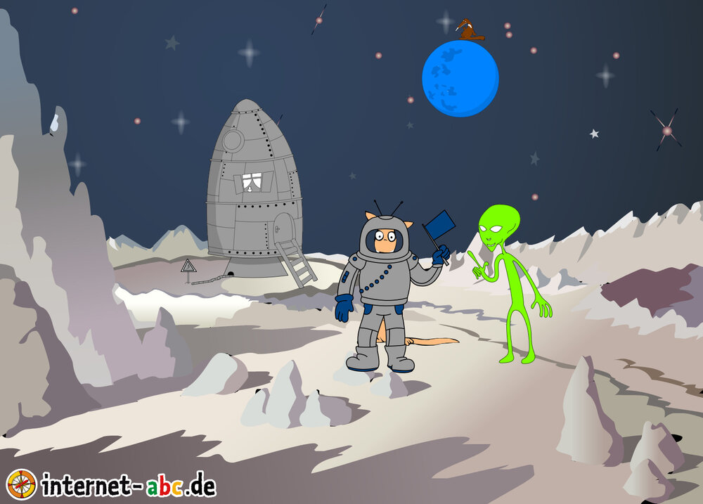Mit der Rakete fliegen die 4 Internet-ABC-Tiere in den Weltraum. Was sie dort sehen und erleben, könnt ihr in diesem Baukasten malen und erzählen.