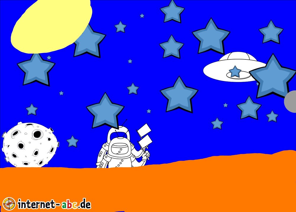 Mit der Rakete fliegen die 4 Internet-ABC-Tiere in den Weltraum. Was sie dort sehen und erleben, könnt ihr in diesem Baukasten malen und erzählen.