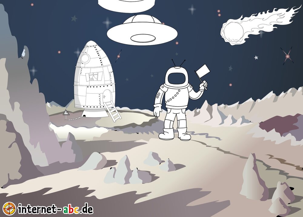 Mit der Rakete fliegen die 4 Internet-ABC-Tiere in den Weltraum. Was sie dort sehen und erleben, könnt ihr in diesem Baukasten malen und erzählen.