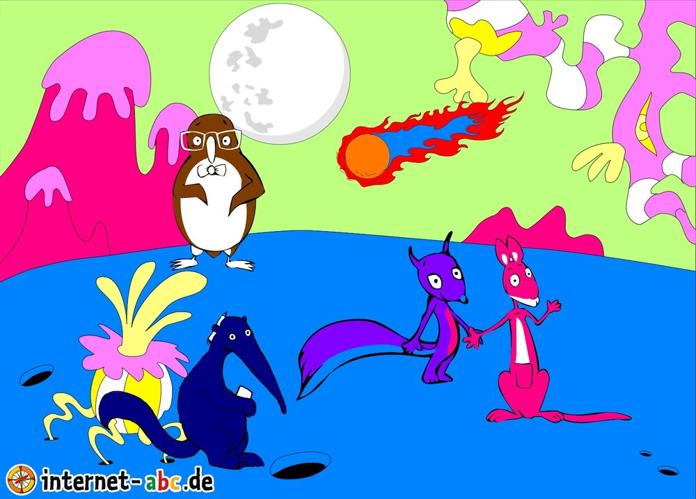 Mit der Rakete fliegen die 4 Internet-ABC-Tiere in den Weltraum. Was sie dort sehen und erleben, könnt ihr in diesem Baukasten malen und erzählen.