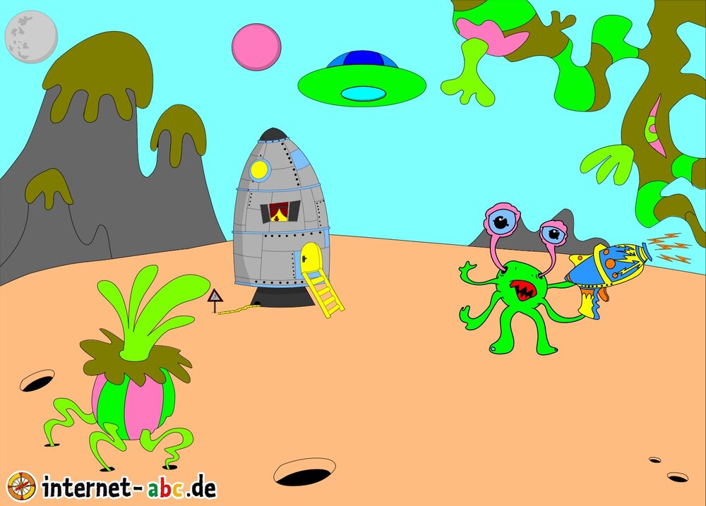 Mit der Rakete fliegen die 4 Internet-ABC-Tiere in den Weltraum. Was sie dort sehen und erleben, könnt ihr in diesem Baukasten malen und erzählen.