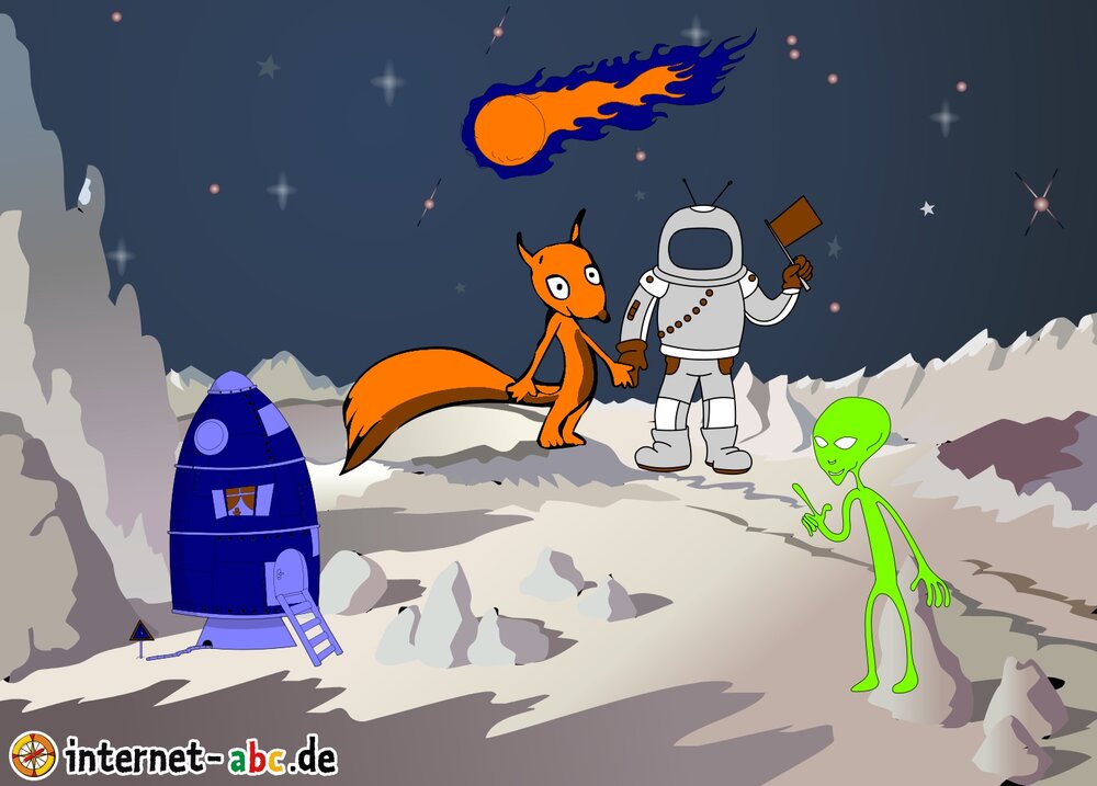 Mit der Rakete fliegen die 4 Internet-ABC-Tiere in den Weltraum. Was sie dort sehen und erleben, könnt ihr in diesem Baukasten malen und erzählen.