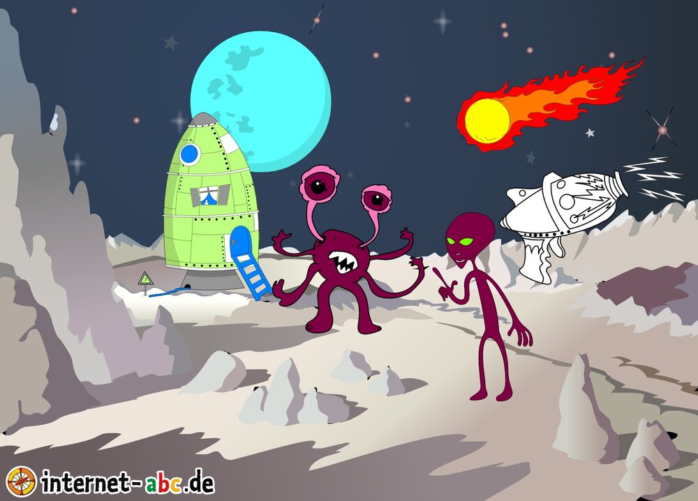 Mit der Rakete fliegen die 4 Internet-ABC-Tiere in den Weltraum. Was sie dort sehen und erleben, könnt ihr in diesem Baukasten malen und erzählen.