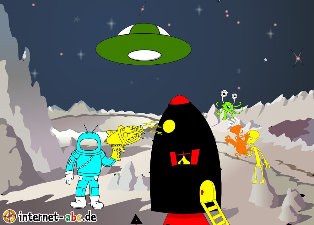 Mit der Rakete fliegen die 4 Internet-ABC-Tiere in den Weltraum. Was sie dort sehen und erleben, könnt ihr in diesem Baukasten malen und erzählen.