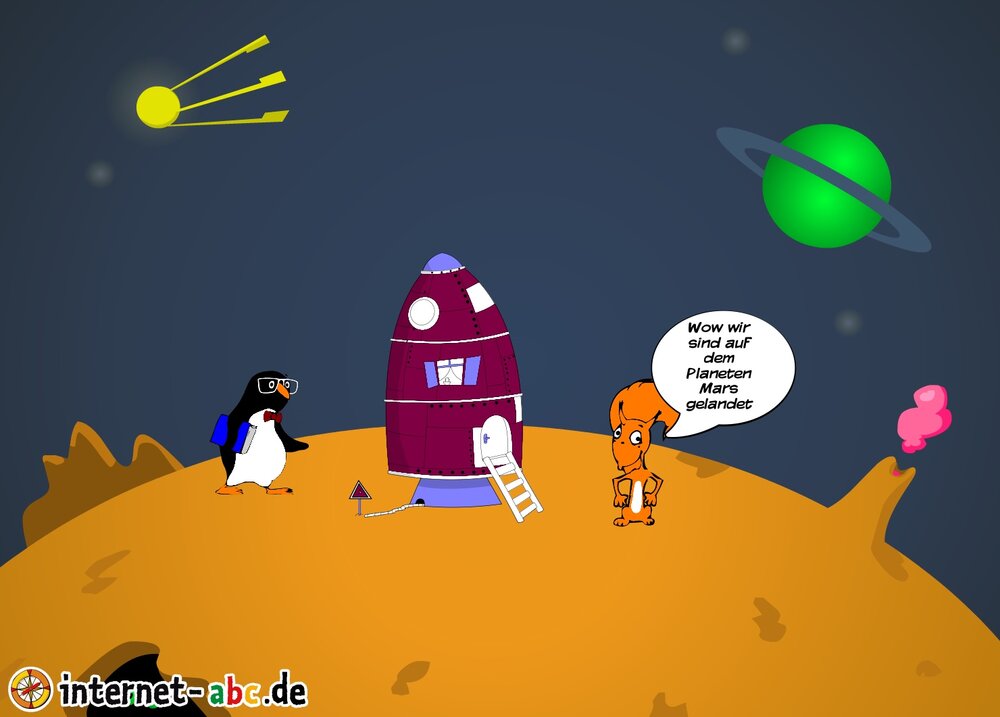 Eines Tages sind Flizzy und der Pinguin in Weltall geflogen.
