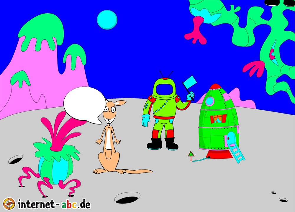 Jumpy ist mit einer Rakete auf den Mond geflogen. Er ist sprachlos weil der Astronaut einen so coolen Raumanzu.