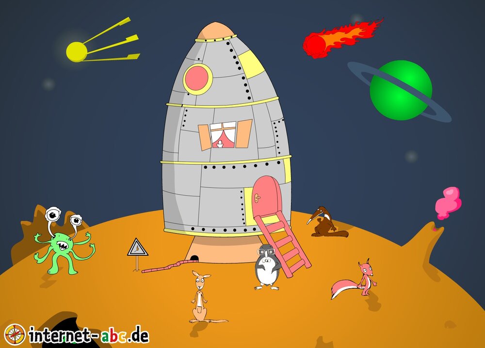 Mit der Rakete fliegen die 4 Internet-ABC-Tiere in den Weltraum. Was sie dort sehen und erleben, könnt ihr in diesem Baukasten malen und erzählen.