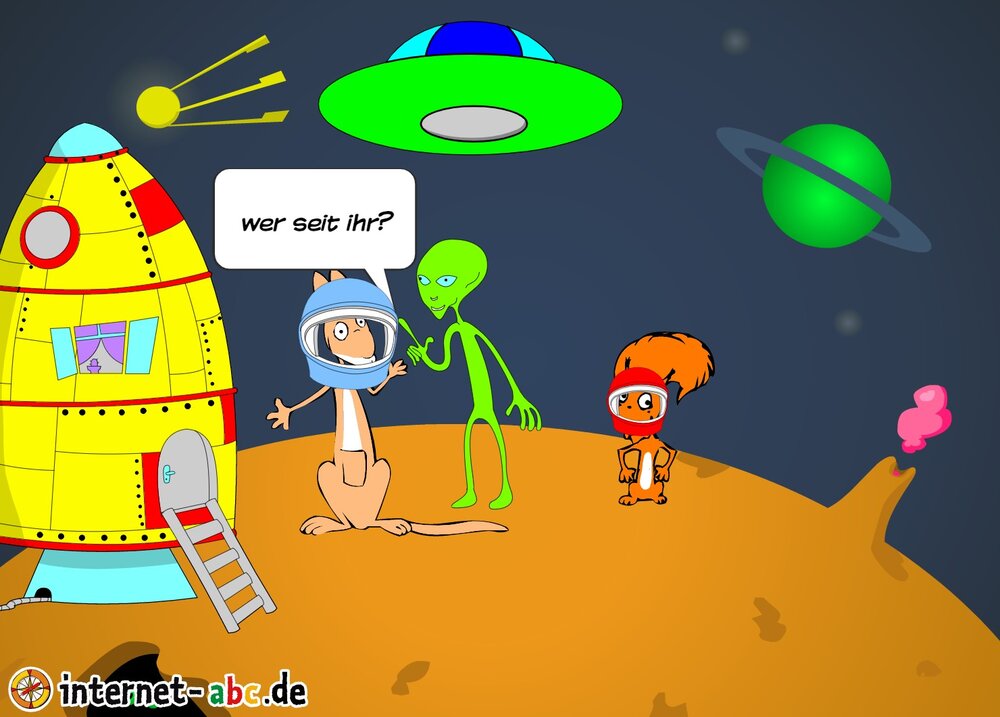 jumpy und flitzi fliegen auf einen anderen Planeten, dort fragt ei auserirdicher wer sie sind.