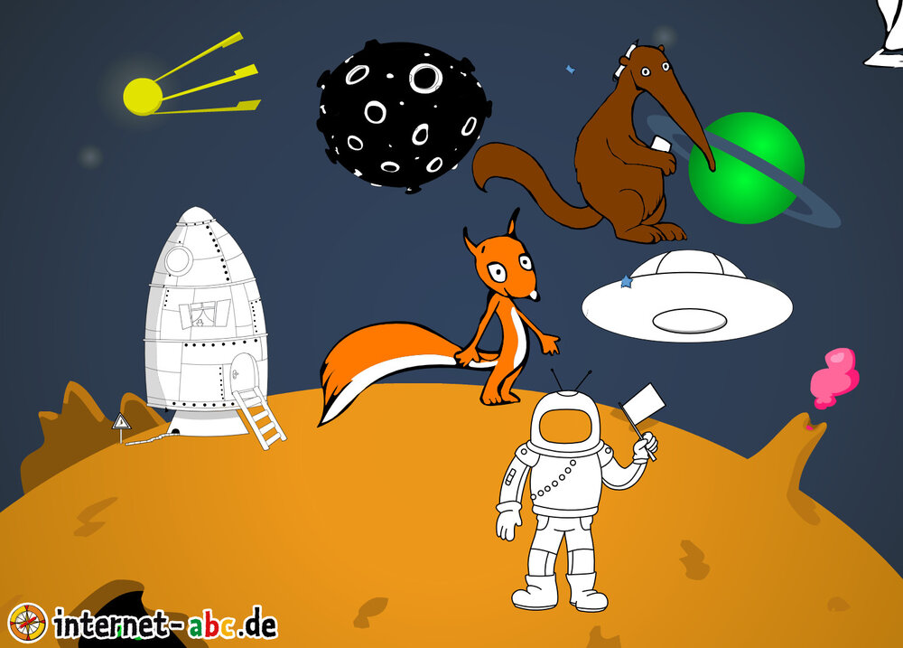 Mit der Rakete fliegen die 4 Internet-ABC-Tiere in den Weltraum. Was sie dort sehen und erleben, könnt ihr in diesem Baukasten malen und erzählen.